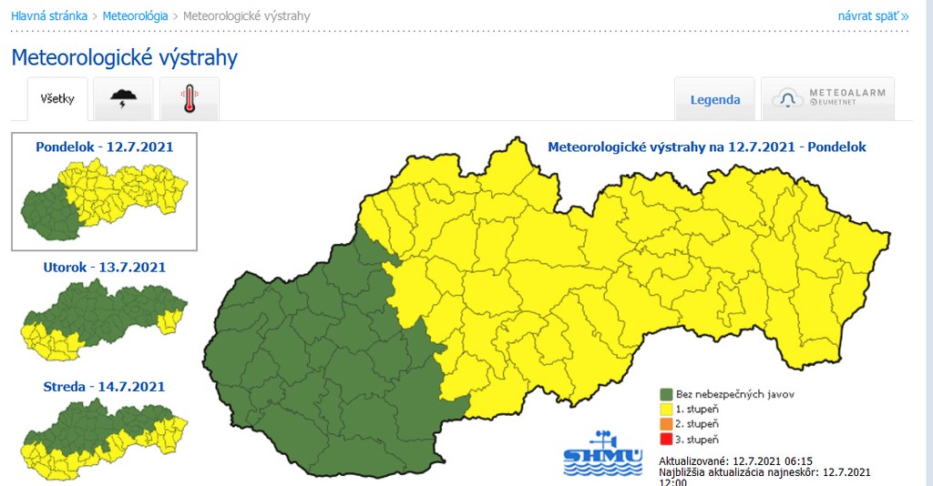 Meteorológovia upozorňujú, že pri búrkach je možný prechodný vzostup vodných hladín na malých tokoch, ako aj stekanie vody zo svahov, bahnotok, zatápanie pivníc, podchodov či podjazdov.