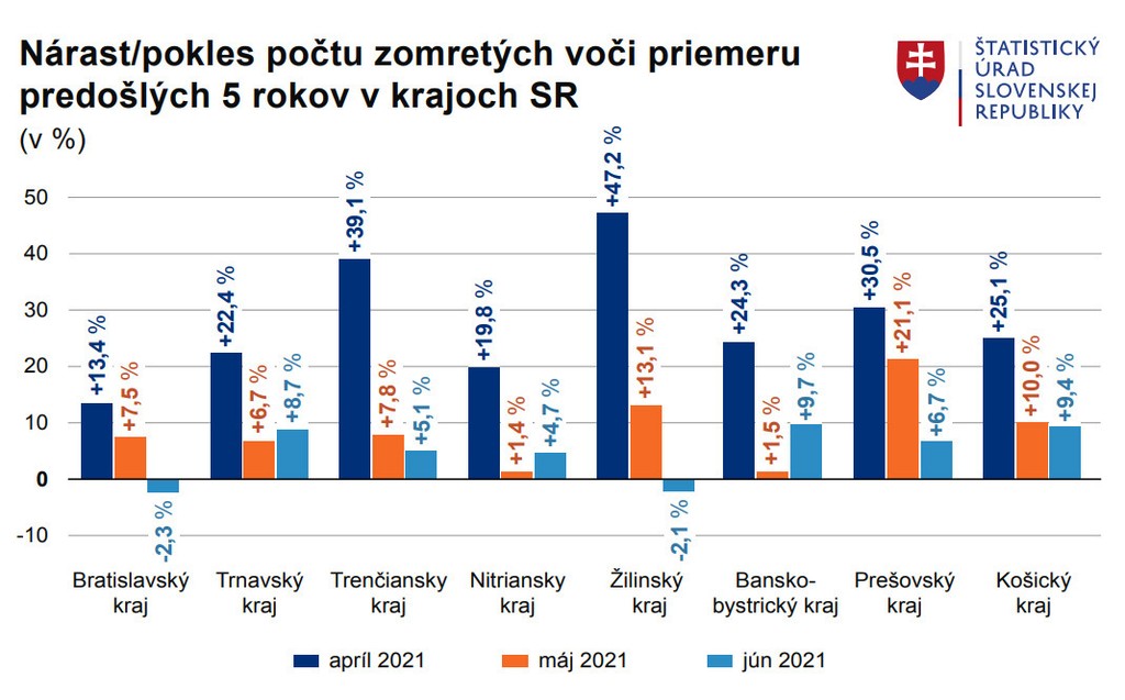 „Nadúmrtnosť je najnižšia od septembra minulého roka, ešte minulý mesiac bola na úrovni deväť percent a pred dvoma mesiacmi v apríli na úrovni 28 percent. Najvyššie hodnoty sme v SR zaznamenali v januári, keď pri rekordných 9,1 tisíca úmrtiach dosiahla skoro 77 percent,“ uviedla Zuzana Podmanická, riaditeľka odboru štatistiky obyvateľstva ŠÚ SR. Počty úmrtí i celková nadúmrtnosť sa tak od začiatku tohto roku plynule znižujú.