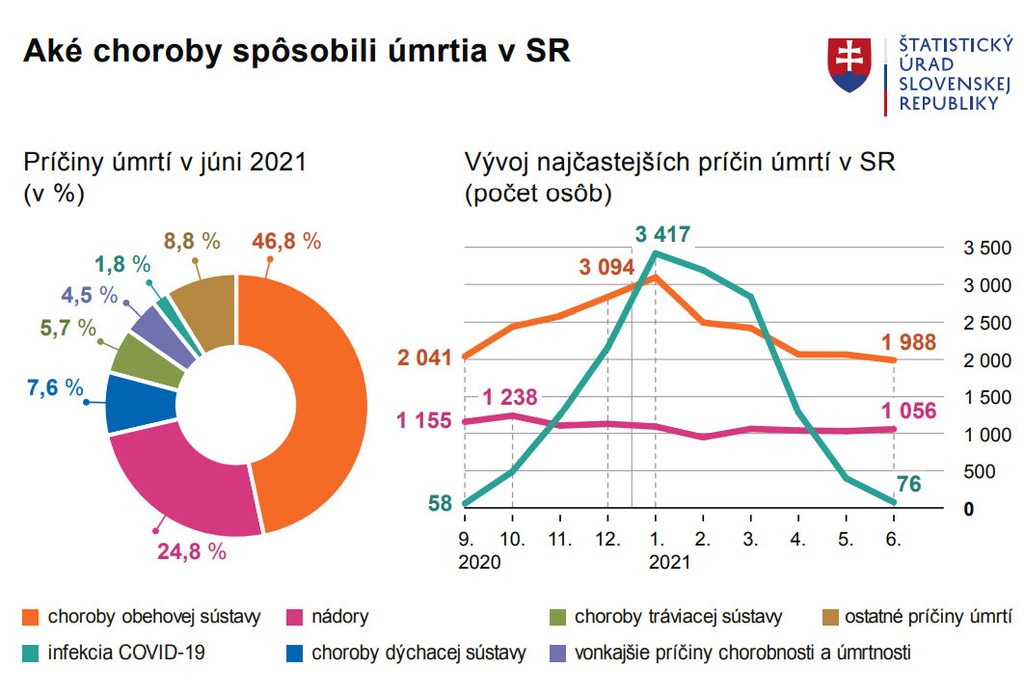 V júni na Slovensku zomrelo takmer 4251 osôb, čo je najmenej za posledných dvanásť mesiacov. Ochorenie COVID-19 už nebolo najčastejšou príčinou úmrtí, kleslo na ôsmu priečku. Najvyššia úmrtnosť bola v skupine mladších seniorov vo veku od 65 do 74 rokov. V stredu o tom v rámci najnovšej štatistiky informoval Štatistický úrad (ŠÚ) SR.