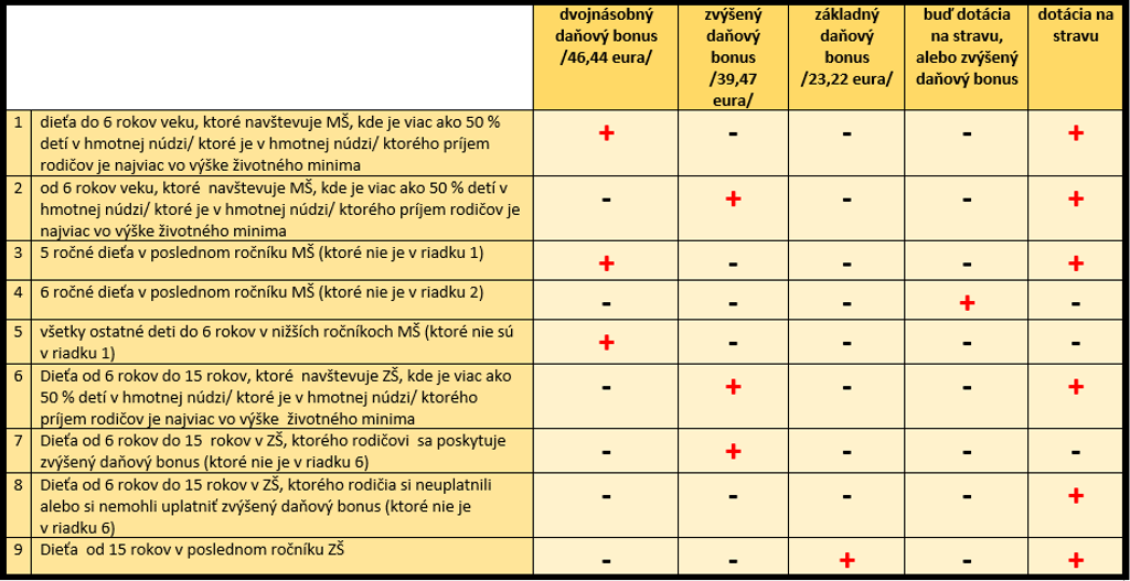 Zmätení ale boli rodičia päťročných predškolákov, ktorí majú nárok aj na najvyšší daňový bonus aj na obedy zadarmo súčasne. Úrady práce im radia, aby kvôli lacnejšej strave tiež škôlke odovzdali čestné vyhlásenie. Keď dieťa dovŕši šesť rokov, môžu sa rozhodnúť buď pre stravu alebo bonus, ale o tejto veci musia informovať žiadateľa.