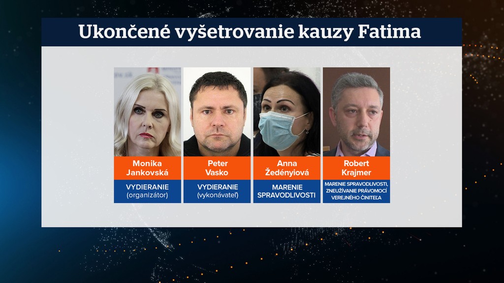 "Pôvodnú vec skončil dňa 4. augusta tohto roku s návrhom na podanie obžaloby na obvinených JUDr. M. J, P. V, JUDr. A. Ž a Mgr. R. K., pričom návrh bol podaný za dva skutky, právne kvalifikované ako zločiny vydierania, marenia spravodlivosti a zneužívania právomoci verejného činiteľa," povedala pre televíziu Markíza hovorkyňa policajného prezídia Denisa Bárdyová.