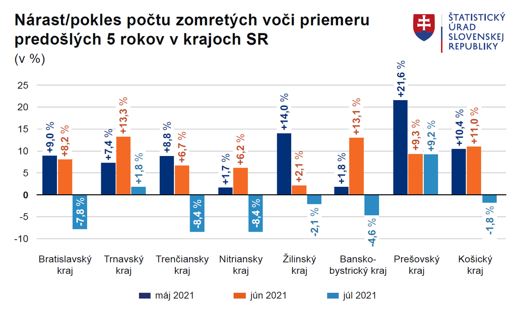 Iba dva kraje zaznamenali v siedmom mesiaci tohto roka väčší počet úmrtí oproti päťročnému priemeru. Najvýraznejšie sa nadúmrtnosť prejavila v Prešovskom kraji, dosiahla hodnotu 9 percent. Miernu nadúmrtnosť zaznamenal aj Trnavský kraj (2 %). Vo zvyšných šiestich regiónoch zomrelo menej osôb ako bol päťročný priemer. Najvýraznejší pokles počtu úmrtí bol v Nitrianskom a Trenčianskom kraji, o vyše 8 percent menej úmrtí než v priemere za posledných 5 rokov.