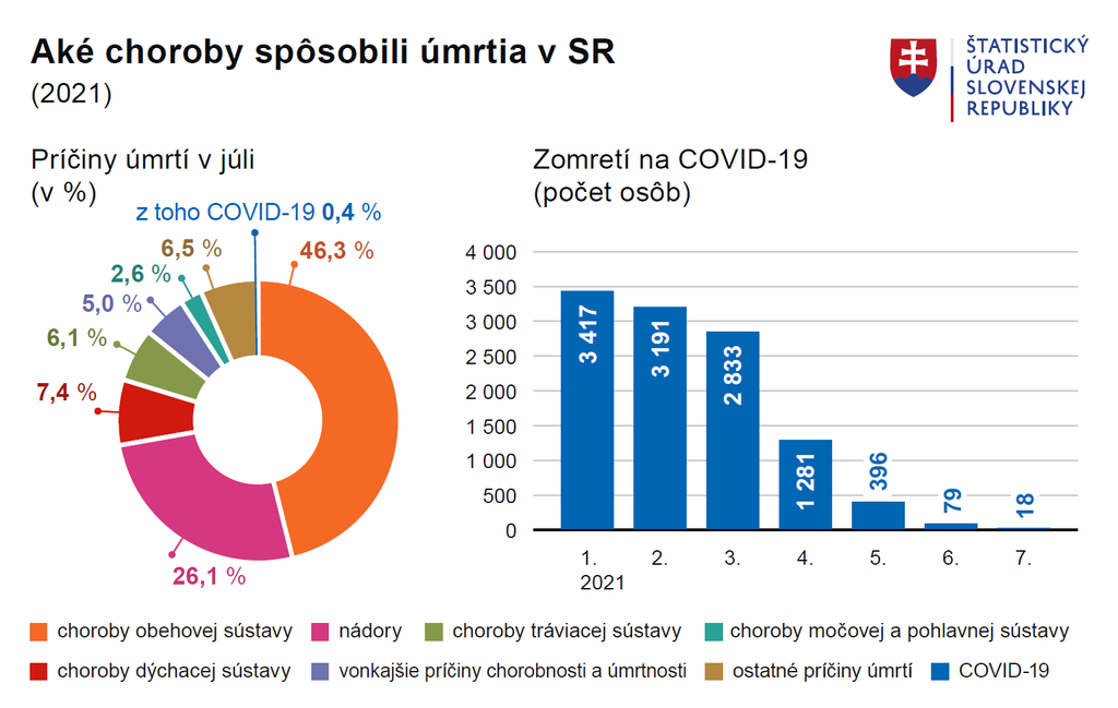 Vyplýva to z predbežných údajov o počtoch zomretých a príčinách úmrtí v júli 2021, ktoré zverejnil Štatistický úrad SR. Súčasne revidoval aj dáta za predošlé mesiace tohto roka.