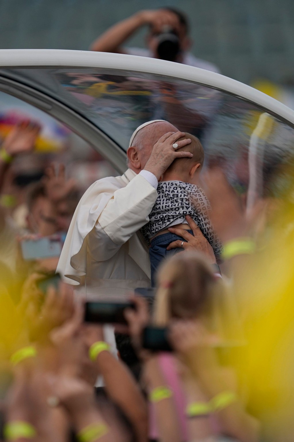17.40 - Tak, ako sme zvyknutí z generálnych audiencií z Vatikánu, aj na štadióne Lokomotívy v Košiciach sa pristavil pri dieťati. Požehnal ho a pobozkal.