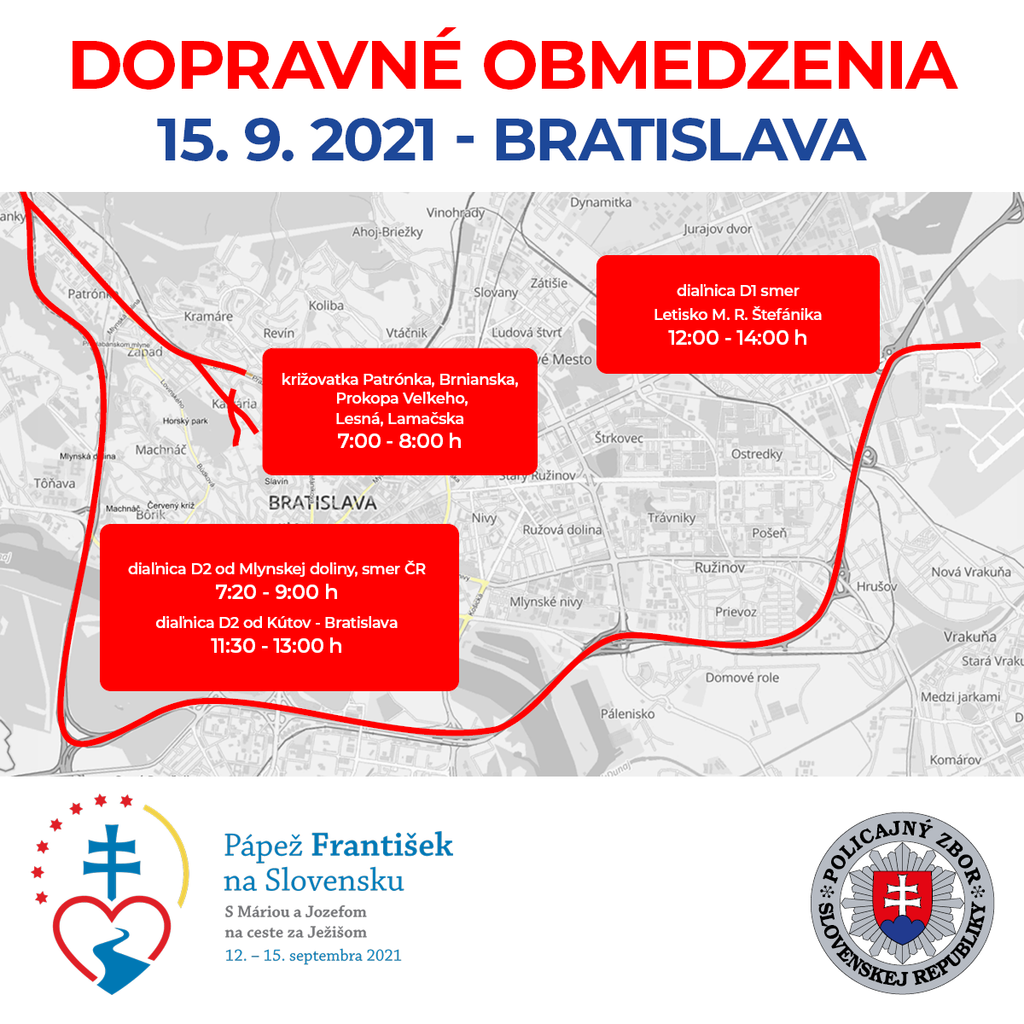 Aj v posledný deň návštevy pápeža Františka budú platiť dopravné obmedzenia. Budú sa však týkať iba Šaštína, kde odslúži omšu a prednesie homíliu a Bratislavy.