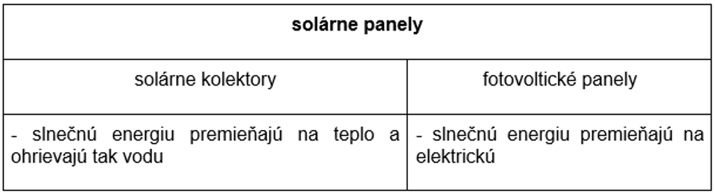 Hlavným rozdielom medzi solárnym kolektorom a fotovoltickým panelom je princíp ich fungovania. Obe zariadenia absorbujú slnečné lúče a premieňajú ich na energiu, preto ich spoločne nazývame solárne panely. Avšak solárny kolektor spotrebúva slnečnú energiu výlučne na výrobu tepla, zatiaľ čo fotovoltický panel premieňa slnečné žiarenie na elektrickú energiu. Spôsob akým jednotlivé panely využívajú slnečnú energiu ukazuje tabuľka.