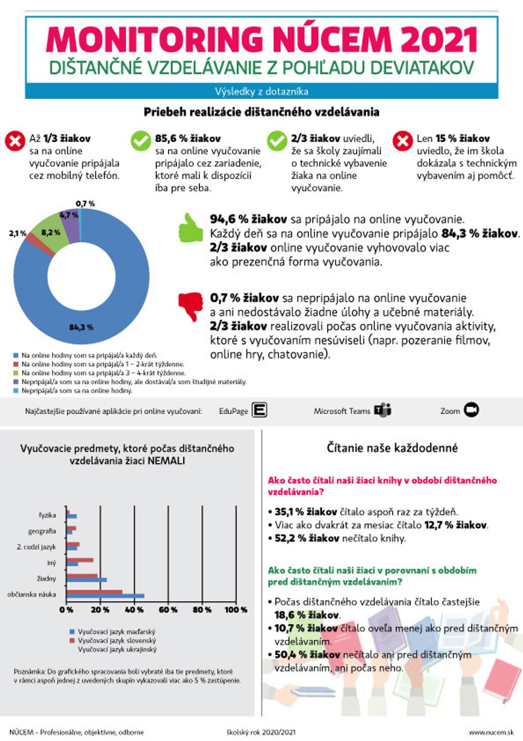 Na prieskume sa zúčastnilo 11 999 žiakov zo 478 škôl na Slovensku. Žiaci vypĺňali dotazník zameraný na skúsenosti s dištančnou (online) formou vzdelávania a riešili aj vedomostné testy z vyučovacích jazykov (slovenský jazyk a literatúra a maďarský jazyk a literatúra) a matematiky.