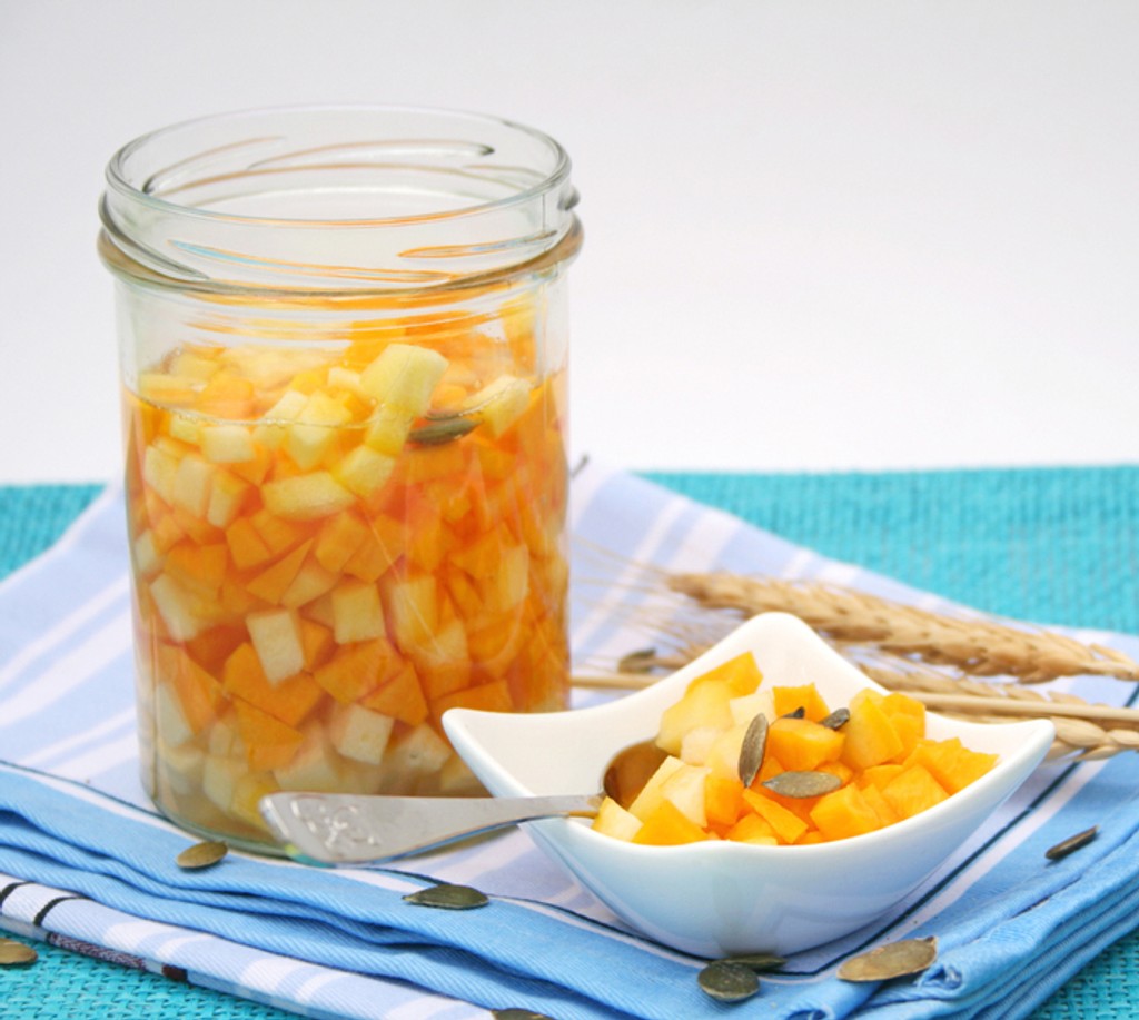 Do pohárov dáme uvarené kúsky tekvice po hrdlo pohára a zalejeme cukrovým sirupom. Pripravíme ho tak, že v litri vody rozpustíme 2 kg cukru a 1,5 polievkovej lyžice kyseliny citrónovej. Spolu uvaríme a teplým zalejeme pripravené tekvice v pohári. Sterilizujeme pri teplote 80 stupňov asi 30 až 45 minút.