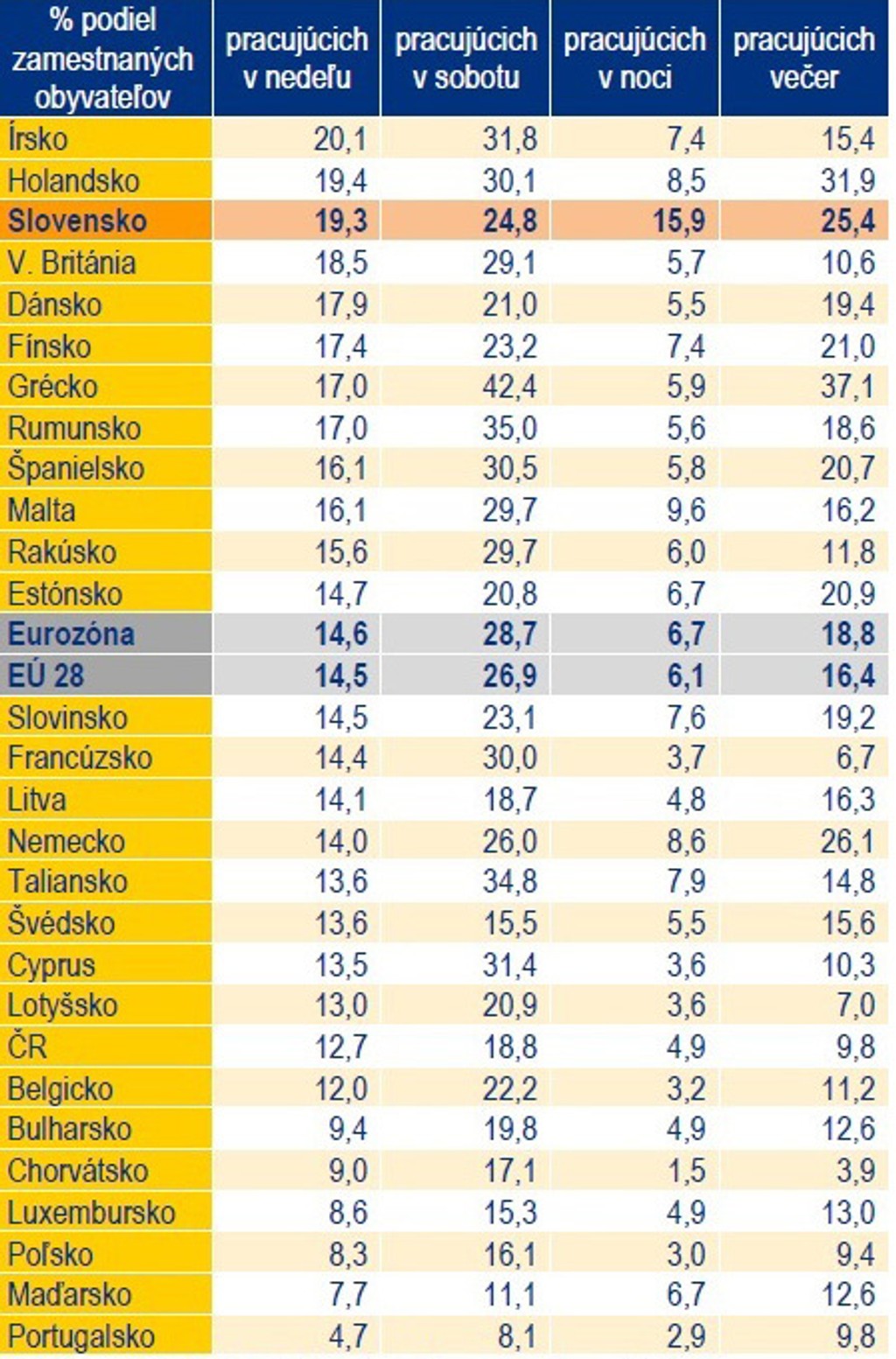 Hovorí sa, že práca šľachtí, ale teší zrejme predsa len menej, než nedeľný obed v pohodlí domova. No približne 19 percent Slovákov si víkendové pohodlie neužíva ani posledný deň týždňa a sme v tomto ukazovateli tretí najpracovitejší národ EÚ. Zistila to Poštová banka z údajov Eurostatu. Medzi štátmi sú pri tom veľké rozdiely, čo vyvoláva viaceré otázky.