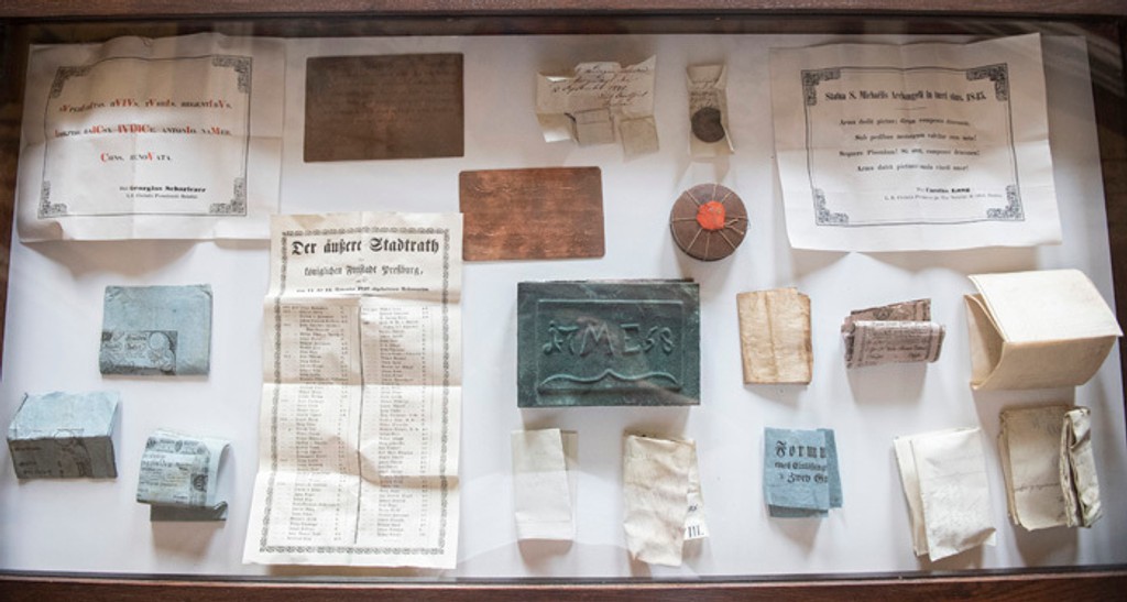 Dokumenty z 18. a 19. storočia, dobové platidlá či výmenné lístky po devalvácii vtedajšej meny po štátnom bankrote, škatuľka s relikviami deviatich svätcov zatavenými v posvätnom vosku, ale tiež medené platničky, mená členov tzv. širšej i užšej mestskej rady či papier s nemeckým textom s menami zhotoviteľov krovu helmice spolu s odkazom v podobe prosby o modlitbu za ich duše z júna 1758.