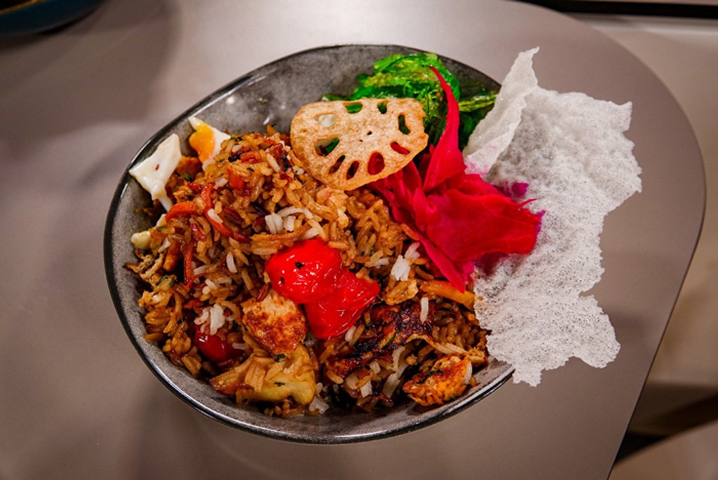 Voľne uvarenú ryžu schladíme studenou vodou. Vopred posolené hovädzie mäso (flank steak - sviečkovica v celom kuse) pečieme asi šesť minút na panvičke na olivovom oleji na medium. Potom ho okoreníme, vyberieme z panvičky a necháme odstáť.