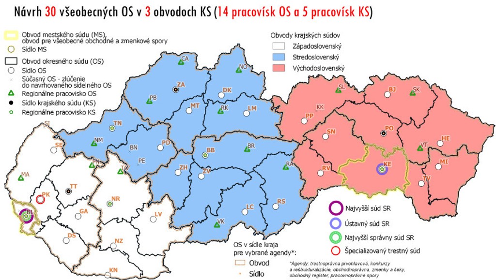 Tých chce ponechať ministerka všetkých osem, ale plánuje zväčšiť ich obvody len na tri. Sídlom krajských súdov by tak mala byť Trnava pre západoslovenský obvod, Žilina pre stredoslovenský obvod a Prešov pre východoslovenský obvod. Nová súdna mapa ráta aj naďalej so vznikom mestských súdov v Košiciach a Bratislave. Zmena by mala nastať k 1. januáru 2023.