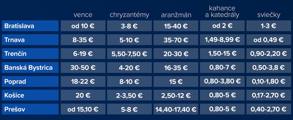 Niektoré ceny za položky sú na celom Slovensku podobné, v iných je vidieť väčší rozdiel. Približne rovnakú sumu zaplatíte za sviečky, v desiatkach centov sa totiž pohybujú ceny za malé čajové sviečky a pár eurv (2-3 eurá) stoja sviečky, ktoré horia viac dní. Iné je to už s kahancami. Tradičné, farebné, sklenené kahance kúpite síce za pár eur, ale moderné katedrály, ktoré sú tento rok trendy, sú omnoho drahšie a stoja od deväť eur. V niektorých lokalitách, ako napríklad v Trenčíne a v Bratislave, nájdete aj za pätnásť.