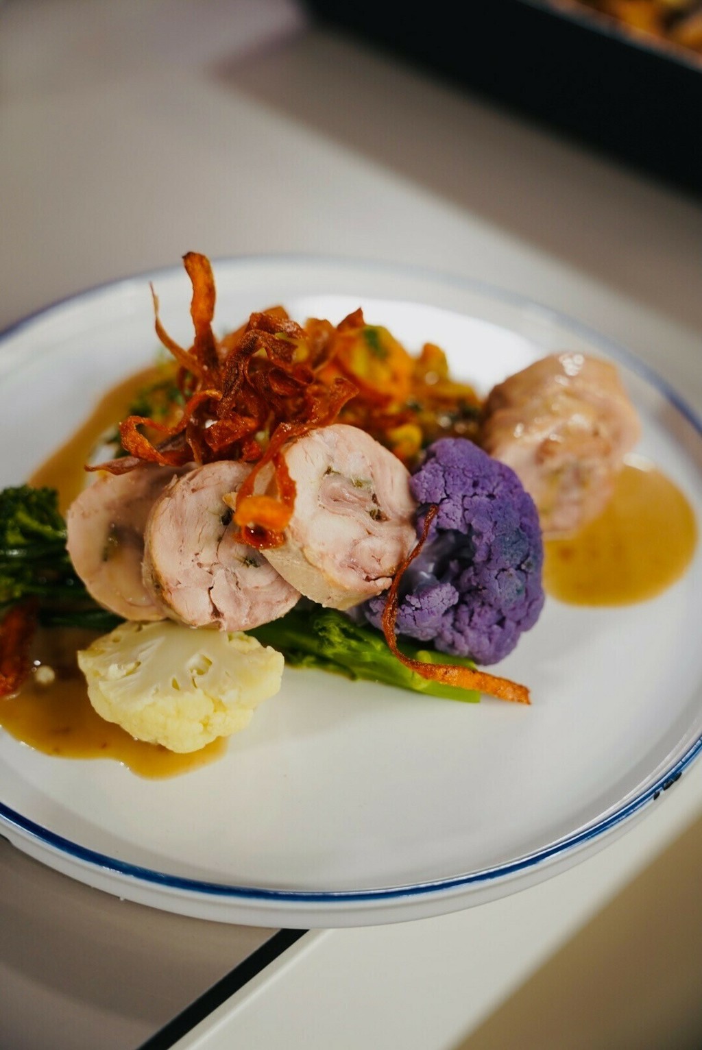 Mäso jemne rozklepneme a nasolíme, pridáme citrónovú kôru, tymián a zrolujeme do rolády. Následne zabalíme do fólie a stočíme do alobalu. Do plechu dáme vodu, ponoríme do nej alobal a pečieme pri teplote 120 stupňov asi tri hodiny. Potom vyberieme a necháme vychladnúť.
