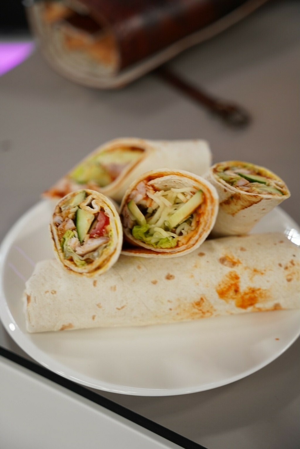 Zvyškové mäso z kuracich stehien a králika natrháme. Majonézu zmiešame s výpekom z králika a potrieme tortillu. Poukladáme mäso a zasypeme syrom a zostatkovou ryžou. Môžeme pridať uhorky alebo inú zeleninu. Tortillu skrútime a podávame.