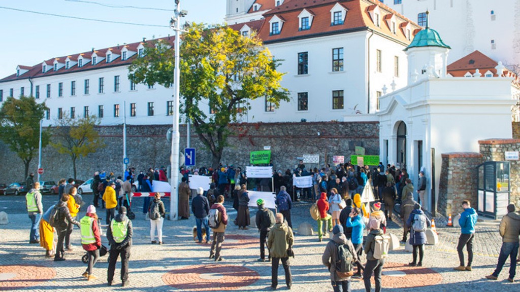 Pred parlamentom protestovali zástancovia aj odporcovia reformy národných parkov. Rozdelili sa po oboch stranách cesty. Odporcovia držia nesúhlasné nápisy proti reforme. Zástancovia svojimi nápismi a pokrikmi vyzývajú poslancov, aby reformu prijali.