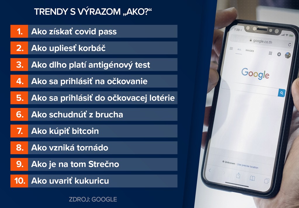 Druhou kategóriou boli výrazy s „Ako", napr. ako získať covid pass, prihlásiť sa na očkovanie alebo do očkovacej lotérie. Dôležitý bol aj antigénový test, ktorý ste potrebovali pre vstup do obchodu alebo práce. Ľudí tiež zaujímalo, ako dlho platí antigénový test. Tento rok vzrástol záujem o investovanie do kryptomeny, a tak ľudia zisťovali ako kúpiť bitcoin.