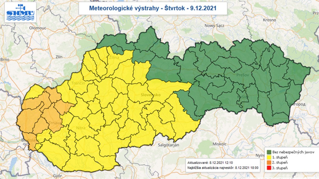 Slovenský hydrometeorologický ústav vydal na štvrtok (9. 12.) pre sneženie výstrahu 2. stupňa. V okresoch Bratislava, Pezinok, Malacky, Senica, Myjava, Piešťany a Trnava by mohlo napadnúť až do 30 cm snehu.