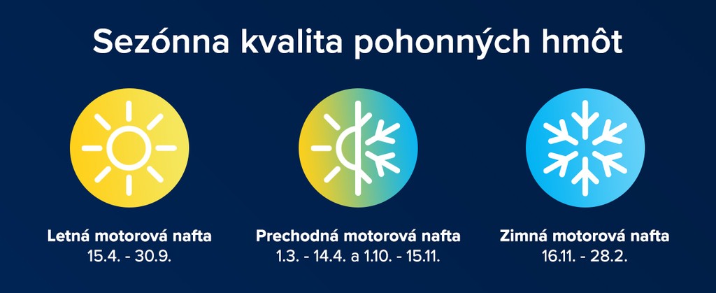 „Na Slovensku je v období od 15. apríla do 30. septembra v predaji letná nafta. Od začiatku októbra do 15. novembra a od začiatku marca do 14. apríla je to prechodná nafta s bodom tuhnutia -10 stupňov. Od 16. novembra do konca februára musí byť všade v predaju zimná nafta triedy F. Tá má stanovený minimálny bod tuhnutia -20 °C,“ vysvetlil motoristický novinár Maroš Čabák z portálu Topspeed.sk. To isté platí aj pre benzín.