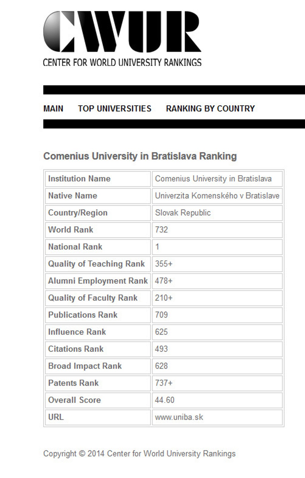 Pred našou UK je pražská Univerzita Karlova (313.), ďalšou v rebríčku je brnianska Masarykova univerzita (742.), potom České vysoké učení technické v Prahe (771.), na Morave nachádzajúca sa Univerzita Palackého v Olomouci (804.) a poslednou je pražská Vysoká škola chemicko-technologická (963).