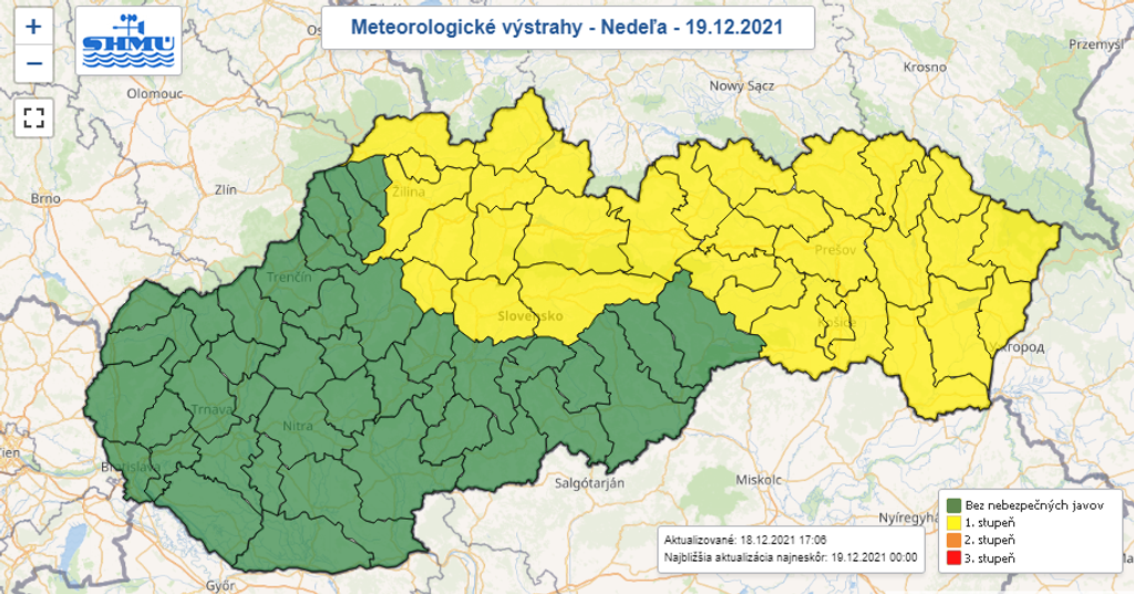 Meteorológovia varujú aj pred tvorbou snehových jazykov a závejov v Žilinskom, Banskobystrickom a Prešovskom kraji. SHMÚ preto vydal výstrahu prvého stupňa na nedeľu (19. 12.) a pondelok (20. 12.).
