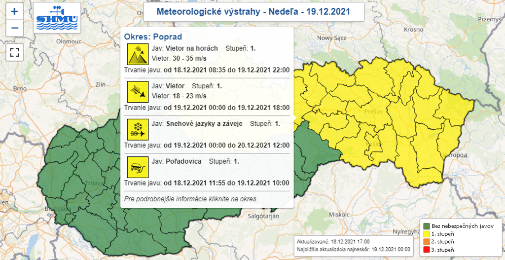 Silný vietor môže fúkať v nedeľu aj v okrese Poprad, kde môže ojedinele dosiahnuť priemernú rýchlosť okolo 45 alebo krátkodobo v nárazoch rýchlosť 65 až 85 kilometrov za hodinu. Zároveň v tomto okrese platia aj ostatné tri spomínané výstrahy.