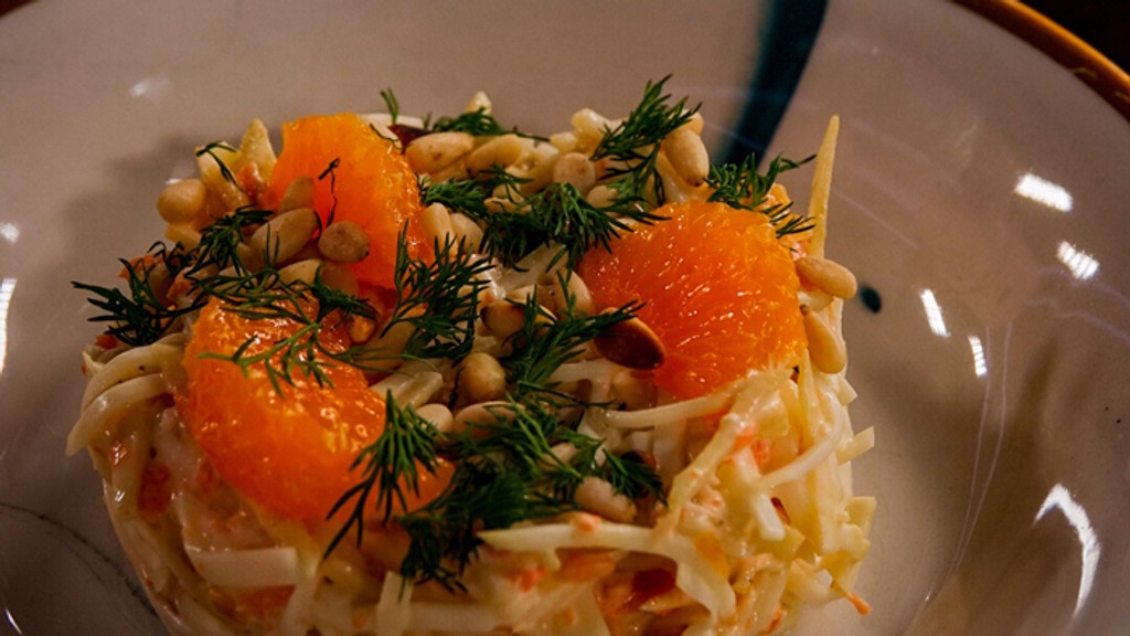 Na dokončenie si pripravíme segmenty mandarínok (vyrežeme ich tak, aby sme sa zbavili dužiny) a opražíme si píniové orechy. Zelerový šalát podávame s kúskami mandarínky, údeným pstruhom, píniovými orechmi a čerstvým kôprom. Môžete tiež použiť napríklad granátové jablko, vlašské orechy prípadne miesto kôpru pažítku. Šalát sa skvele hodí k rybe prípadne hydine, môžete ho však pokojne jesť aj samotný, s opečenou hriankou a strateným vajíčkom.