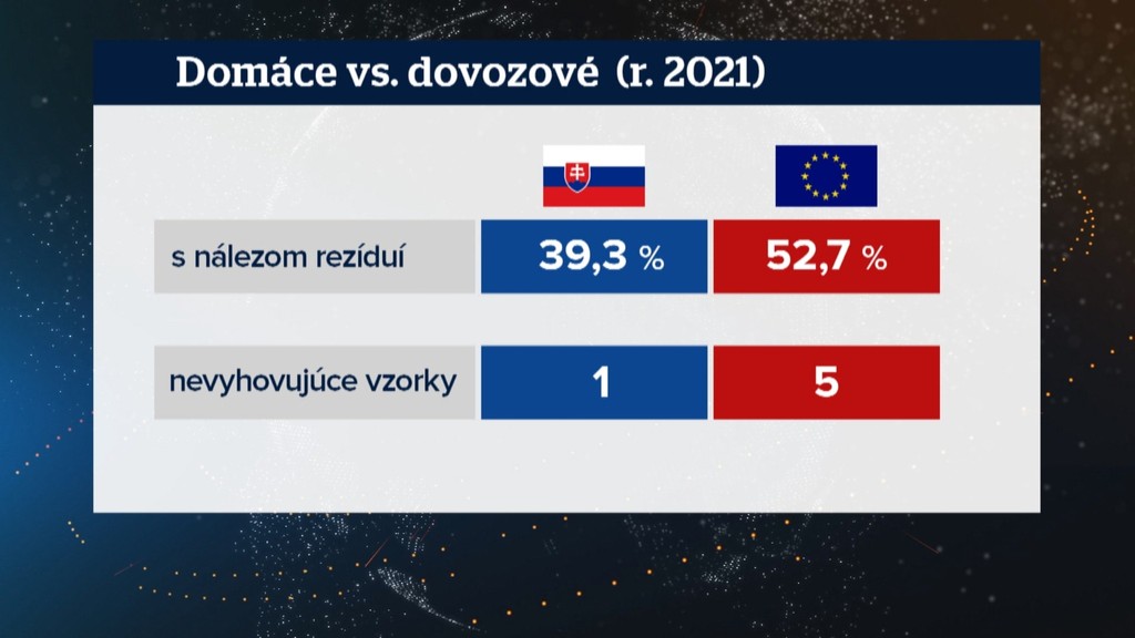 Vyše polovica testovaných potravín dovezených z únie bola pozitívna na pesticídy, päť vzoriek prekročilo povolené limity. Slovenských potravín s nálezom bolo ani nie 40 percent. Jedna vzorka raže nevyhovela. Asi najhoršie dopadli potraviny z tretích krajín.