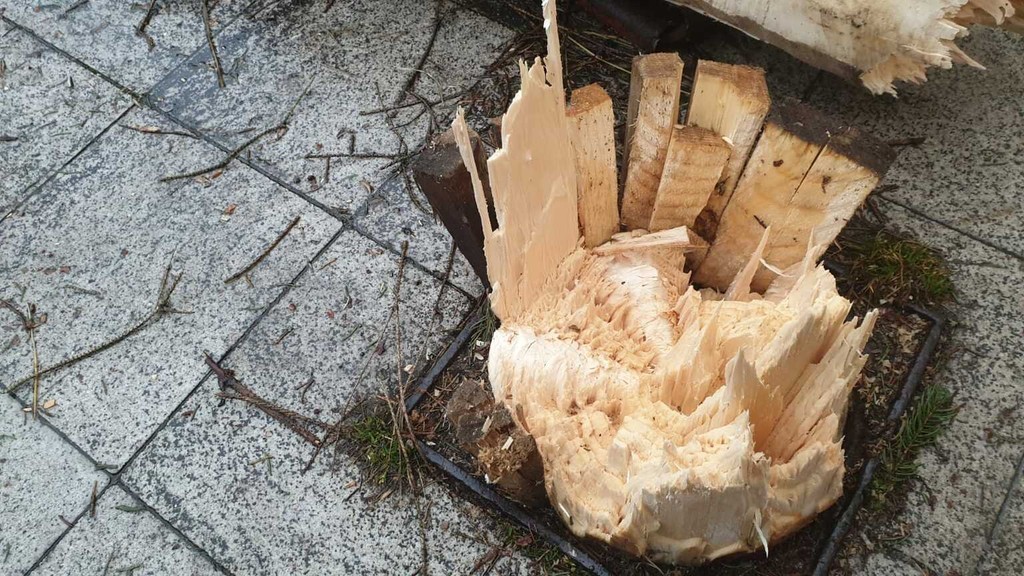 Dramatické chvíle na ružomberskom hlavnom námestí. Uplynulú noc, kedy bol v oblasti vyhlásený druhý stupeň výstrahy pred vetrom, sa zlomil a spadol desaťmetrový vianočný stromček. Pri páde stromu sa nikto nezranil.
