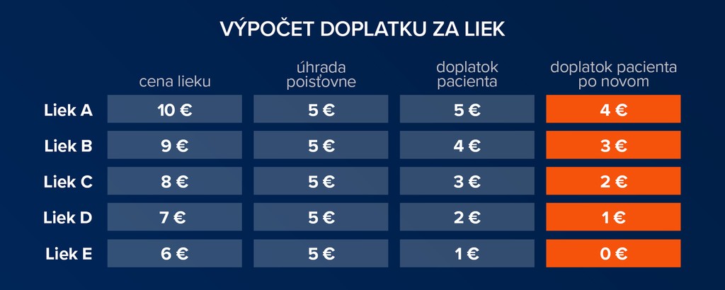 Vysvetlenie: Keďže najnižší doplatok má liek E (1 €), táto suma sa započíta do limitu spoluúčasti, a teda za tento liek pacient nezaplatí nič a u všetkých ostatných liekov sa doplatok zníži o 1 €.
