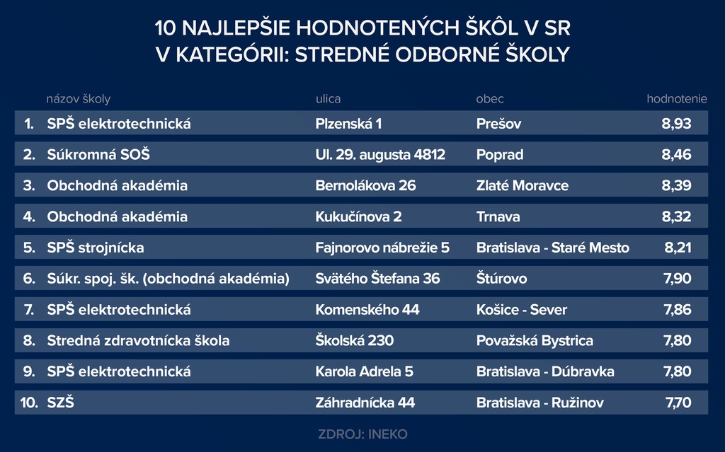 Pri stredných odborných školách (SOŠ) obhájila prvé miesto SPŠ elektrotechnická na Plzenskej ul. v Prešove. Na druhú priečku sa po významnom raste hodnotenia prepracovala Súkromná SOŠ, ktorá sídli na Ulici 29. augusta v Poprade (pred rokom bola na 25. priečke). Zo štvrtého na tretie miesto sa posunula Obchodná akadémia na Bernolákovej v Zlatých Moravciach.