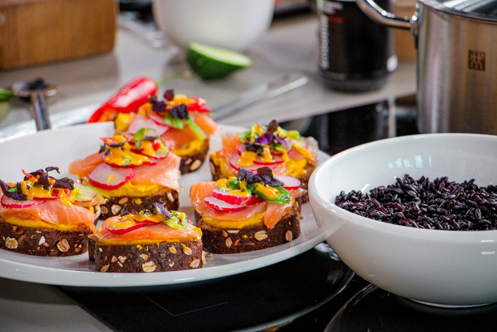 Ingrediencie na menu pre 4 člennú rodinu: farmársky chlieb, ryžový papier, 400 g nórskeho chladeného lososa, 800 g varenej ryže, 150 g Edamame soy, 4 mrkvy, 1/2 hlavy červenej kapusty, 3-4 ks jarnej cibuľky, 1 PL čierneho sezamu, 1 viazanička reďkovky, 1 uhorka, 100 g Wakame rias, 30 g čerstvého koriandru, 3 PL sójovej omáčky, micro bylinky (brokolica, žerucha...), kurkumový hummus
