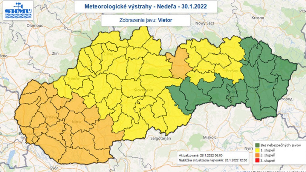Varovanie prvého stupňa pred vetrom vydal SHMÚ počas piatka pre Bratislavský, Trenčiansky, Nitriansky, Trnavský a Prešovský kraj. Vietor môže v nárazoch dosiahnuť rýchlosť 65 až 85 kilometrov za hodinu.