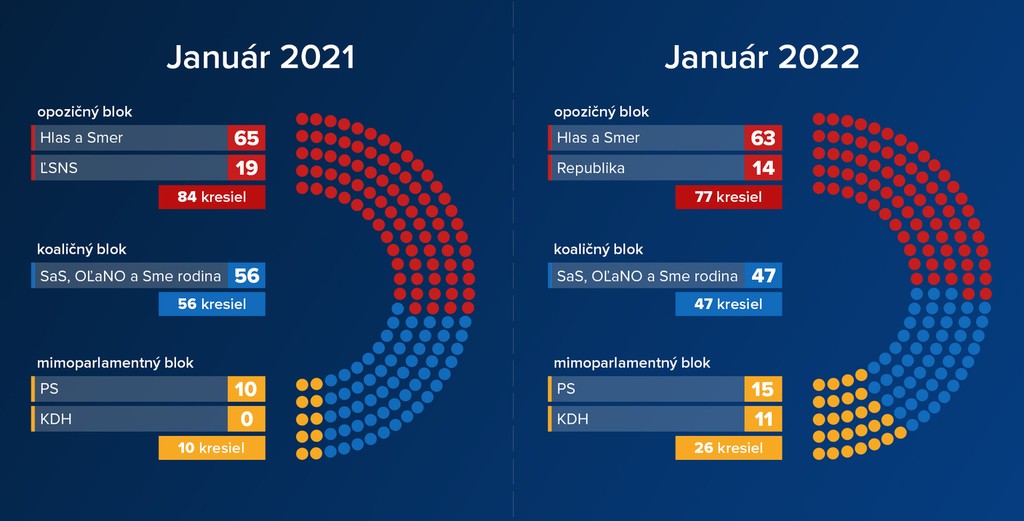 Súčasná parlamentná opozícia by teda takto pred rokom obsadila v parlamente až 84 kresiel, dnes 77. Treba však dodať, že kým v januári by sa partnerom Smeru a Hlasu musela stať ĽSNS, čo nebolo vôbec reálne, v súčasnosti je to Republika, ktorá až tak možným politickým partnerom „nesmrdí“.