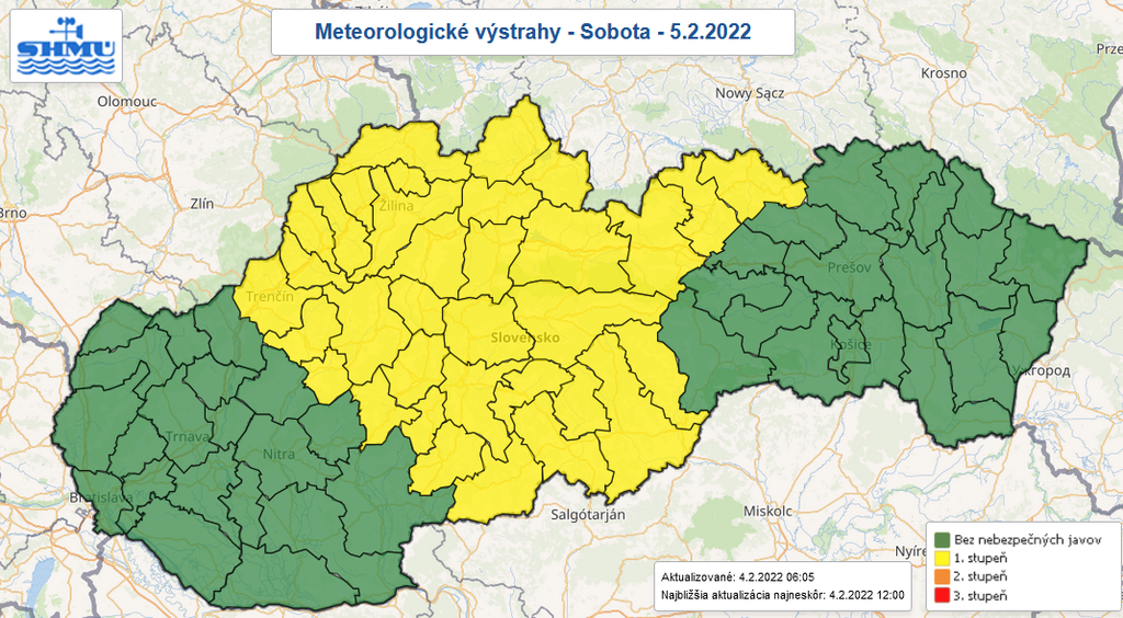Výstrahu prvého stupňa pred tvorbou snehových jazykov a závejov vydali meteorológovia na sobotu (5. 2.) od 4.00 do 18.00 h. Platí pre okresy na Orave, Kysuciach, Liptove a v okolí Vysokých Tatier.