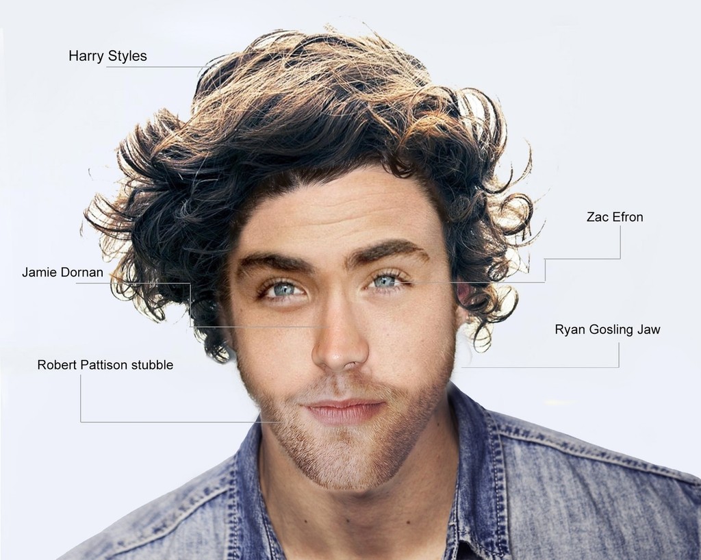 Chirurgovia vytvorili dve tváre na základe požiadaviek, s ktorými najčastejšie chodia pacienti. Samozrejme, že ich inšpiráciou a vzormi sú hlavne celebrity. Prvá tvár je mladšia. Ideálny muž by mal mať vlasy ako spevák Harry Styles z One Direction, prenikavé modré oči herca Zaca Efrona, strnisko Roberta Pattinsonsa a čeľusť Ryana Goslinga.