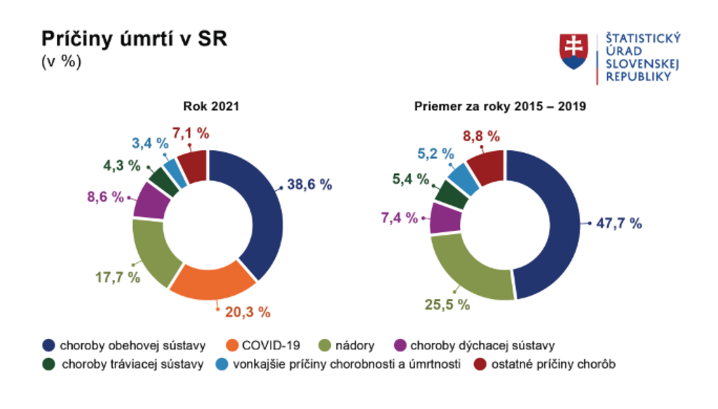 Na zvýšení celkovej nadúmrtnosti sa okrem covidu podieľali tiež úmrtia spôsobené ochoreniami obehového systému, ich počet v porovnaní s priemerom narástol vlani takmer o 11 %. Dlhodobo ide o prevládajúcu príčinu úmrtí v našej krajine s vlaňajším podielom 38,6 % na všetkých úmrtiach (28,3 tisíca osôb).