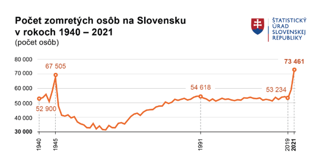 Od vtedy sa Slovenskom prehnal ešte silnejší delta variant (omikron sa naplno prejavil až v prebiehajúcom roku) a ukázal svoju silu. Štatistici totiž zaznamenali ešte viac obetí, ako tomu bolo počas vojnového roku 1945 (zhruba 67 500). Minulý rok na Slovensku teda zomrelo viac ako 73-tisíc ľudí, čo je najvyšší absolútny počet od roku 1919.