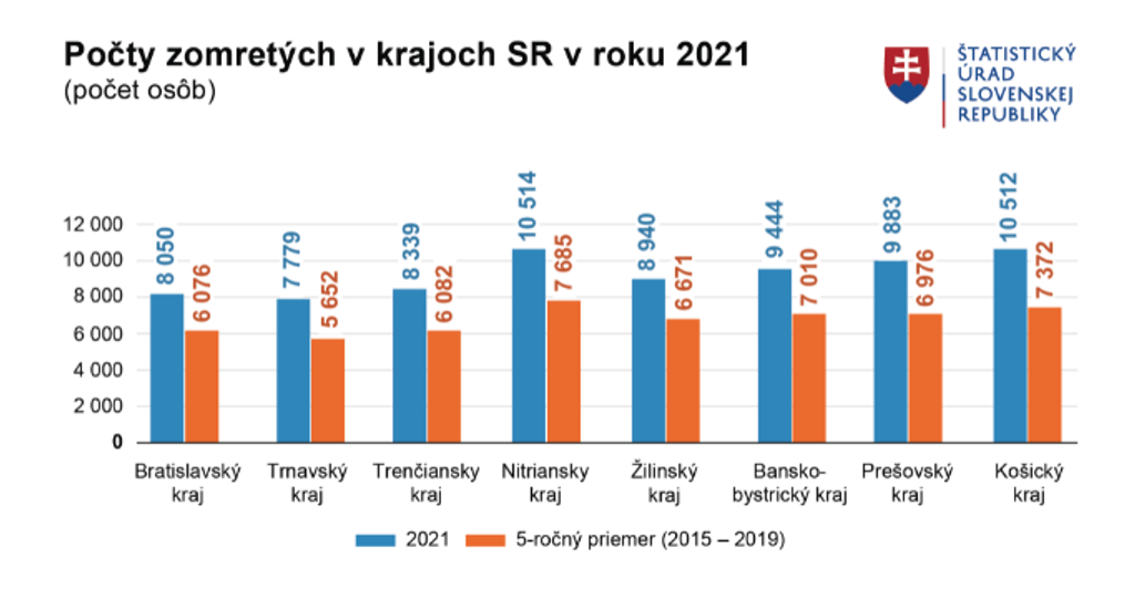 „Najvýraznejší nárast počtu zomretých oproti obdobiu pred pandémiou1) bol v Košickom kraji (o 43 %) a v Prešovskom kraji (o 42 %). Tieto regióny zaznamenali rasty úmrtnosti najmä na konci roka, s vrcholom v novembri, kedy počet zomretých voči priemeru bol na dvojnásobných hodnotách,“ píše štatistický úrad vo svojej správe.