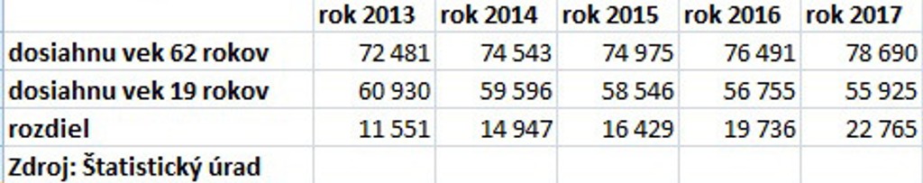 Ak by všetci odchádzali do dôchodku vo veku 62 rokov a do práce nastupovali vo veku 19 rokov a ostali zachované počty ľudí z roka 2012, v priebehu piatich rokov by do penzie odišlo zhruba o 85-tisíc ľudí viac, než by sa zapojilo do pracovného procesu.