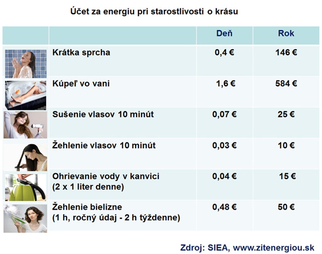 Údaje vypočítali tak, že rátali s cenou teplej vody 10 € za m3 a elektriny 0,2 € za kWh. Ak chcete ďalšie užitočné rady ako usporiť energiu i peniaze, viac sa dočítate na stránke www.zitenergiou.sk
