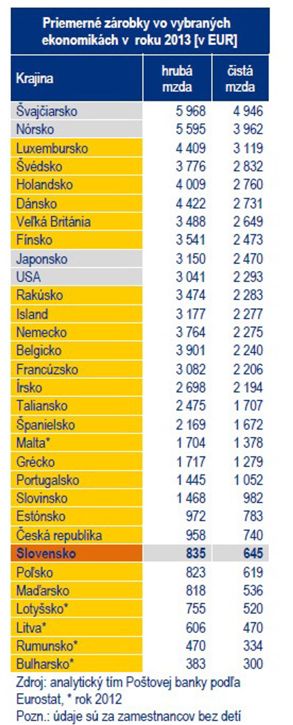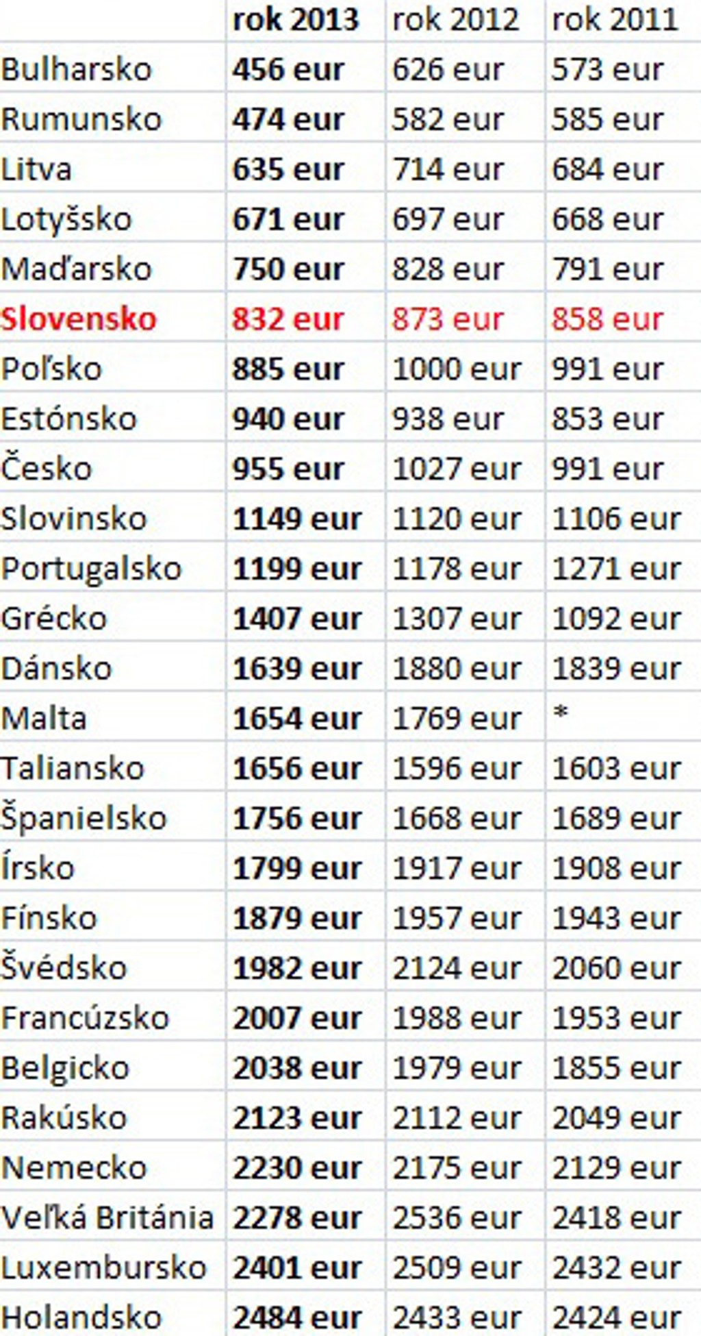 Prehľad o platoch v EÚ po zohľadnení tamojších cien. Údaje za rok 2013 vypočítané na základe informácií od Poštovej banky. Čísla za roky 2012 a 2011 sú údaje Eurostatu podľa jeho metodiky - pokles medzi rokmi 2012 a 2013 teda neznamená, že chudobnieme, ale že ide o inú metodiku: