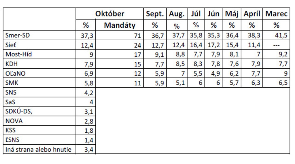Strana vedená premiérom Robertom Ficom by získala 37,3 percenta hlasov, čo by pre ňu znamenalo 71 kresiel v parlamente. Neparlamentnej strane Sieť by dalo hlas 12,4 percenta opýtaných (24 mandátov) a tretí by skončil Most-Híd s deviatimi percentami (17 kresiel).