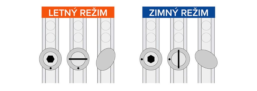 Najskôr si pozdĺž celého rámu okna nájdite súčiastky, ktoré regulujú tesnenie. Podľa obrázku nižšie ich nastavte do požadovanej polohy. Na pootočenie súčiastky vám netreba žiadne špeciálne náradie, bude vám stačiť skrutkovač alebo imbusový kľúč. Oválny typ skrutky stačí pootočiť prstami. Nič však nerobte silou a v prípade problémov radšej kontaktujte servisného technika. Po správnom nastavení letného režimu by sa mala kľučka na okne otvárať ľahšie.