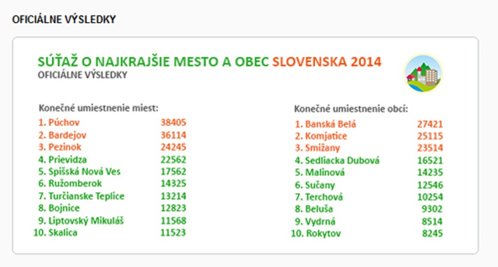 Vyplýva to z výsledkov 6. ročníka súťaže Najkrajšie mesto a obec Slovenska 2014. Ľudia mohli hlasovať od 1. apríla do 31. októbra na portáli Slovakregion, informovala Lenka Kadašová z portálu.