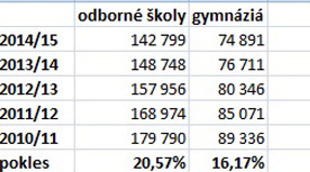 Z aktuálnych čísiel Ústavu informácií a prognóz školstva vyplýva, že napriek výzvam politikov i zástupcov priemyslu, na odborné školy Slováci zatiaľ viac detí neposielajú. Pod tlakom demografickej krízy ubúdajú študenti tam i na gymnáziách.