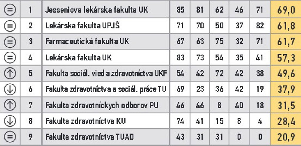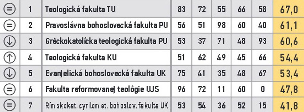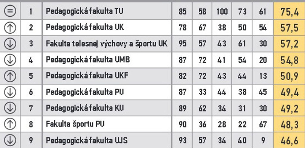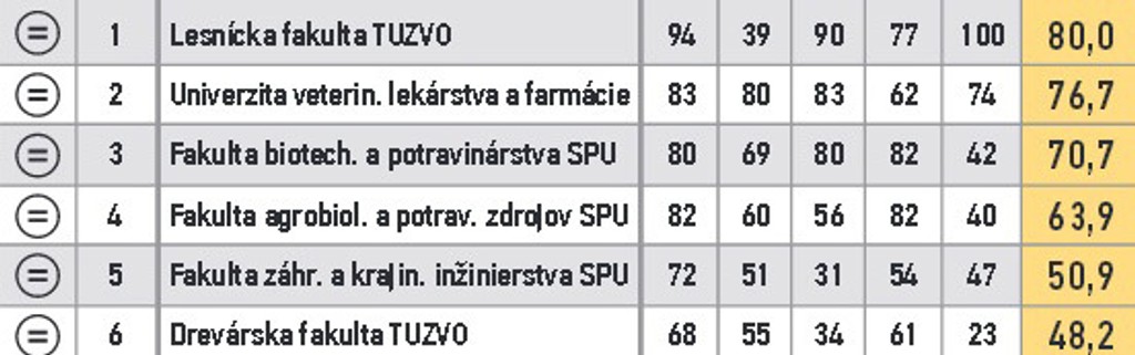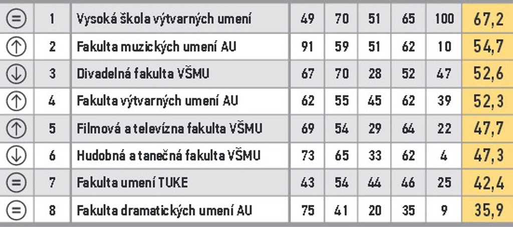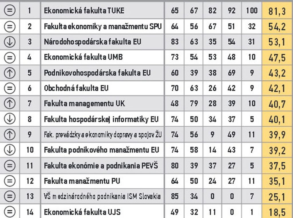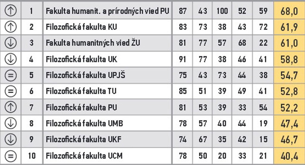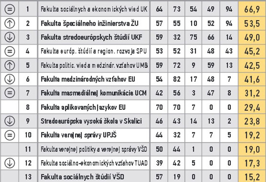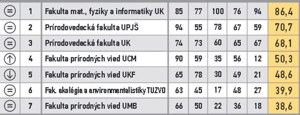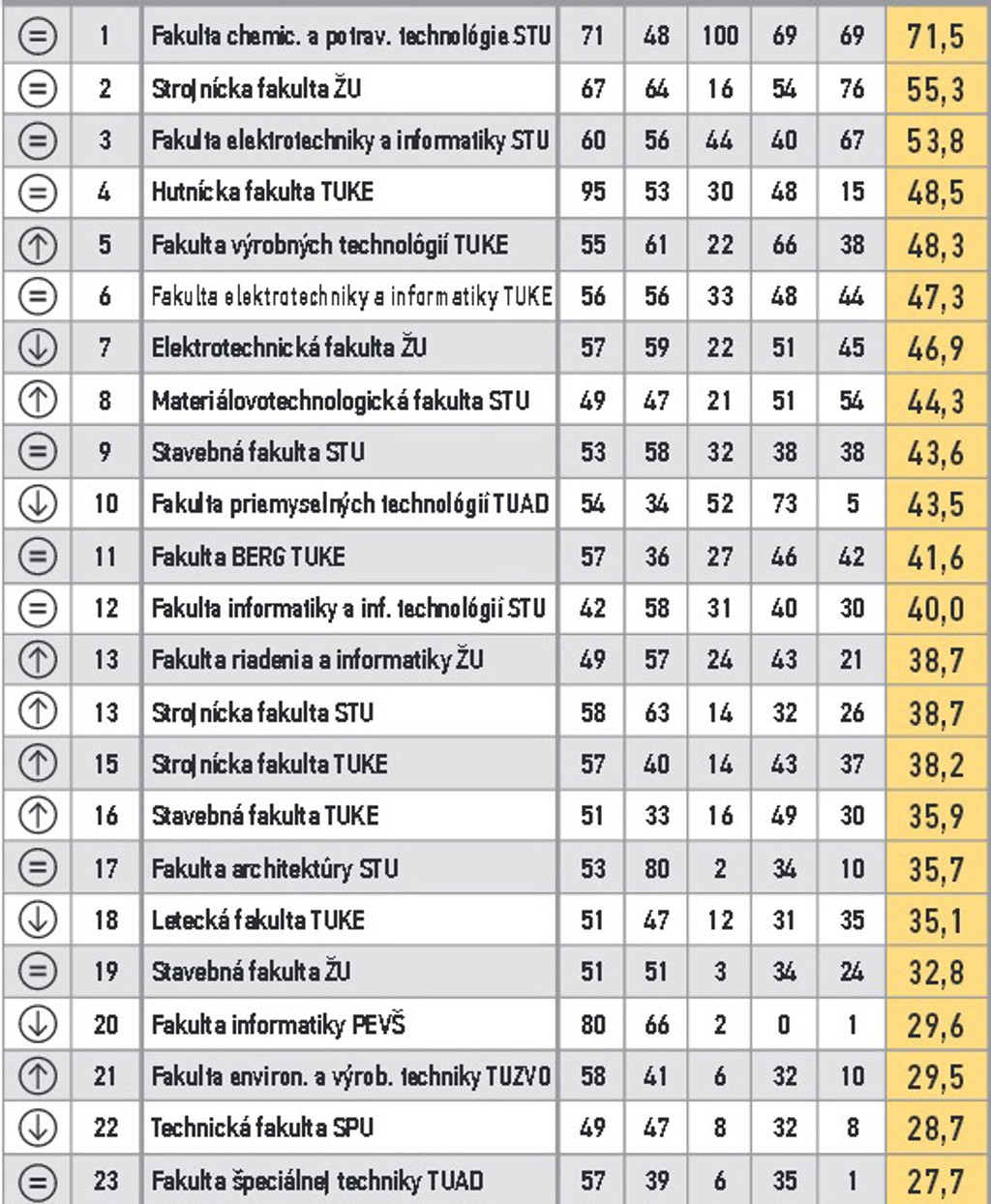 ARRA zoradila fakulty do 11 skupín. V prvom stĺpci je zaznamenaná zmena oproti predošlému roku. V druhom poradie v skupine, nasleduje názov, body za vzdelávanie, za atraktivitu štúdia, vedu a výskum, doktorandov, grantovú úspešnosť a celkový bodový priemer.