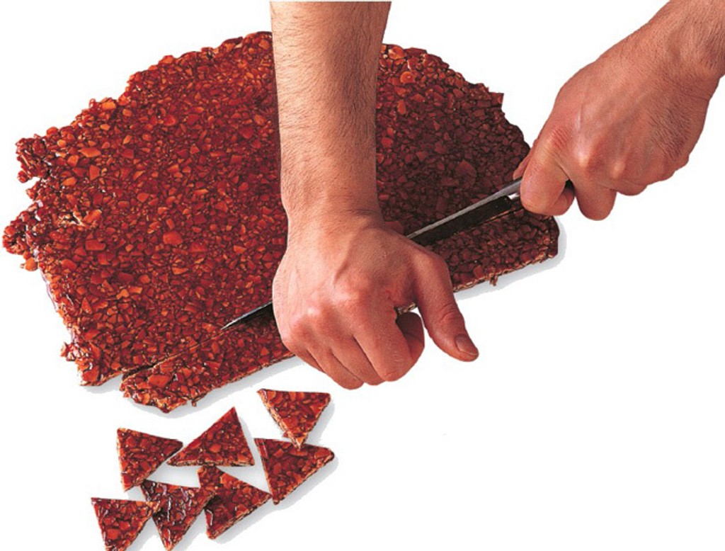 2. Keď je nugatín vyvaľkaný na hrúbku 5 mm, nakrájame ho teplým naolejovaným šéfkuchárskym nožom na menšie kúsky.