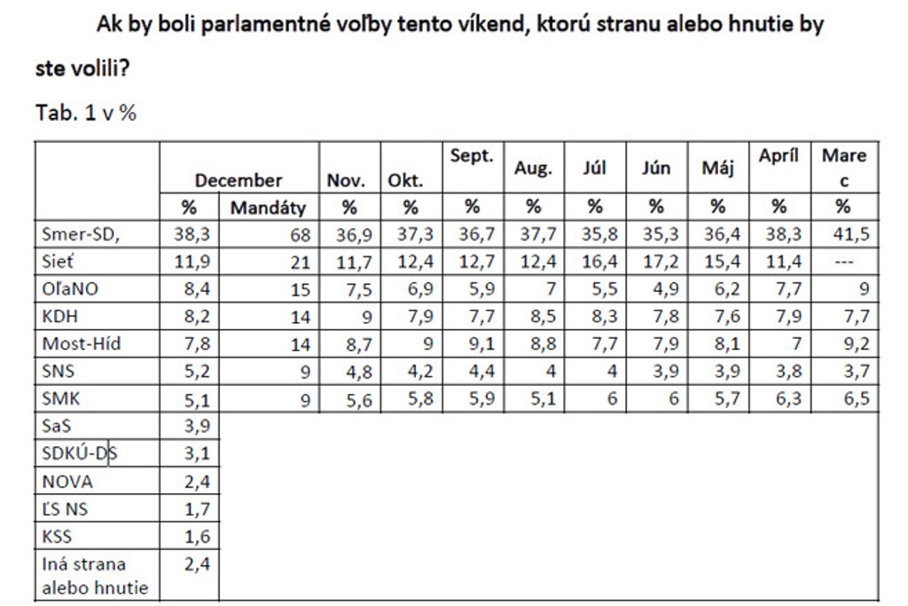 Smer-SD je stále najpopulárnejšia strana a požíva dôveru 36,9 percenta ľudí. Ak sa konali parlamentné voľby tento víkend, v parlamente by mali socialisti 38 kresiel.