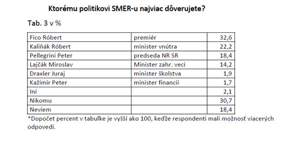 Posledná otázka v prieskume sa týkala dôveryhodnosti politikov vládnej strany. Najlepšie obstál šéf strany a premiér Robert Fico, ktorému verí 32,6 percenta ľudí.